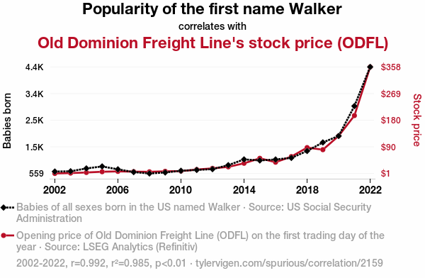 "Old Dominion Freight Line stock price correlation," "Walker name influence on stock prices," "US Social Security Administration data analysis," "LSEG Analytics analysis," "stock price correlation coefficient calculation," "causal relationship study in finance," "Walker name popularity impact on finance," "market movements and first name analysis," "Walker enthusiasts impact on stock market," "The Walking Dead influence on finance," "bull market influence of the name Walker."