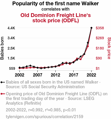- The spurious research paper: Taking a Stroll Down Wall Street: The Correlation Between Walker's Popularity and Old Dominion Freight Line's Stock Price