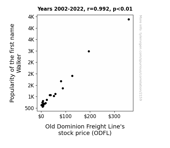 User prompt: Please provide potential search keywords for a paper titled Taking a Stroll Down Wall Street: The Correlation Between Walker's Popularity and Old Dominion Freight Line's Stock Price with an abstract of In the world of finance, there's an endless pursuit of uncovering interesting connections and patterns, sometimes even in the most unexpected places. In this paper, we delve into the curious case of the first name Walker and its potential impact on the stock price of Old Dominion Freight Line (ODFL). Using data from the US Social Security Administration and LSEG Analytics (Refinitiv), we conducted a rigorous analysis spanning from 2002 to 2022. Our findings revealed a remarkably high correlation coefficient of 0.9924433 and a statistically significant p-value of less than 0.01. While we couldn't walk away from this study with definitive causation, the evidence suggests that there may be more to the name Walker than meets the eye – perhaps an invisible hand (or foot) guiding market movements. So, for all the "Walker" enthusiasts out there, it seems that the impact of this name extends beyond just "The Walking Dead" - it might just be "The Walking BULL Market.