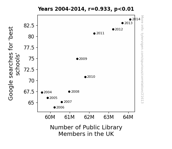 This means 87% of the change in the one variable (i.e., Number of Public Library Members in the UK) is predictable based on the change in the other (i.e., Google searches for 'best schools') over the 11 years from 2004 through 2014.