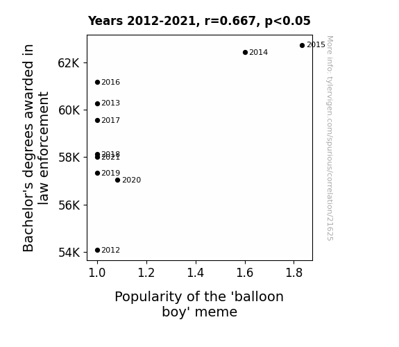 This means 44.4% of the change in the one variable (i.e., Popularity of the 'balloon boy' meme) is predictable based on the change in the other (i.e., Bachelor's degrees awarded in law enforcement) over the 10 years from 2012 through 2021.