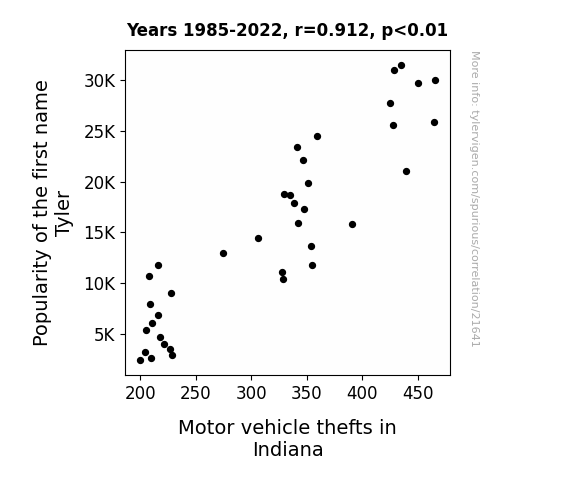 This means 83.3% of the change in the one variable (i.e., Motor vehicle thefts in Indiana) is predictable based on the change in the other (i.e., Popularity of the first name Tyler) over the 38 years from 1985 through 2022.