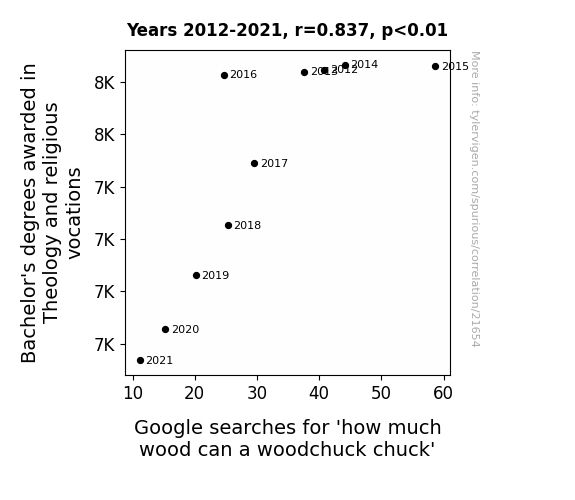 This means 70.1% of the change in the one variable (i.e., Google searches for 'how much wood can a woodchuck chuck') is predictable based on the change in the other (i.e., Bachelor's degrees awarded in Theology and religious vocations) over the 10 years from 2012 through 2021.