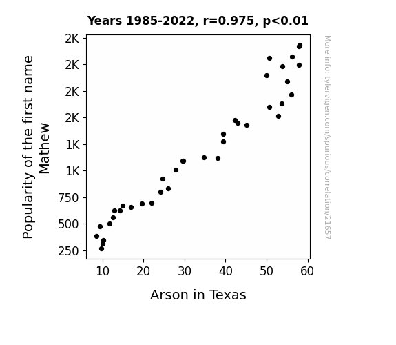 This means 95.1% of the change in the one variable (i.e., Arson in Texas) is predictable based on the change in the other (i.e., Popularity of the first name Mathew) over the 38 years from 1985 through 2022.