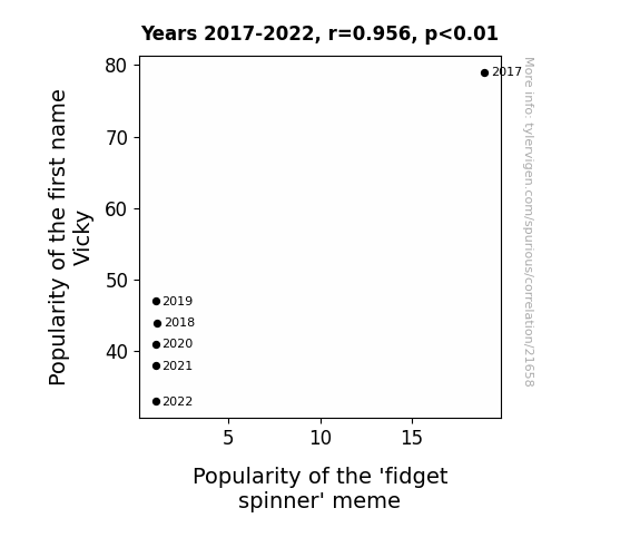 This means 91.4% of the change in the one variable (i.e., Popularity of the 'fidget spinner' meme) is predictable based on the change in the other (i.e., Popularity of the first name Vicky) over the 6 years from 2017 through 2022.