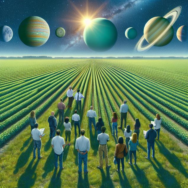 Prompt: Generate an image of a vast open field in Florida, with rows of crops stretching as far as the eye can see. In the center of the field, a group of agricultural sciences teachers stands under the bright sun, discussing the growth of the crops. In the distance, the serene view of the solar system unfolds, with Uranus visible far off in the sky, creating a tranquil and spacious backdrop against the brilliant sun. The depiction should include only scenes, people, and objects, it should not include text or speech bubbles.