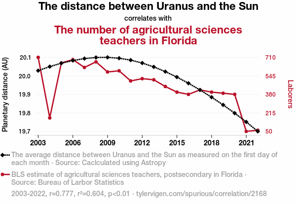This means 60.4% of the change in the one variable (i.e., The number of agricultural sciences teachers in Florida) is predictable based on the change in the other (i.e., The distance between Uranus and the Sun) over the 20 years from 2003 through 2022.