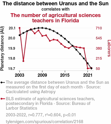 A linear line chart with years as the X-axis and two variables on the Y-axis. The first variable is The distance between Uranus and the Sun and the second variable is The number of agricultural sciences teachers in Florida.  The chart goes from 2003 to 2022, and the two variables track closely in value over that time. Small Image