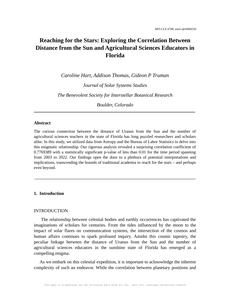 User prompt: Please provide potential search keywords for a paper titled Reaching for the Stars: Exploring the Correlation Between Distance from the Sun and Agricultural Sciences Educators in Florida with an abstract of The curious connection between the distance of Uranus from the Sun and the number of agricultural sciences teachers in the state of Florida has long puzzled researchers and scholars alike. In this study, we utilized data from Astropy and the Bureau of Labor Statistics to delve into this enigmatic relationship. Our rigorous analysis revealed a surprising correlation coefficient of 0.7769389 with a statistically significant p-value of less than 0.01 for the time period spanning from 2003 to 2022. Our findings open the door to a plethora of potential interpretations and implications, transcending the bounds of traditional academia to reach for the stars – and perhaps even beyond.