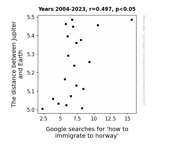 This means 24.7% of the change in the one variable (i.e., Google searches for 'how to immigrate to norway') is predictable based on the change in the other (i.e., The distance between Jupiter and Earth) over the 20 years from 2004 through 2023.