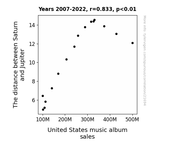 This means 69.4% of the change in the one variable (i.e., United States music album sales) is predictable based on the change in the other (i.e., The distance between Saturn and Jupiter) over the 16 years from 2007 through 2022.