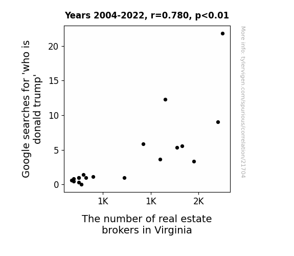 This means 60.8% of the change in the one variable (i.e., The number of real estate brokers in Virginia) is predictable based on the change in the other (i.e., Google searches for 'who is donald trump') over the 19 years from 2004 through 2022.