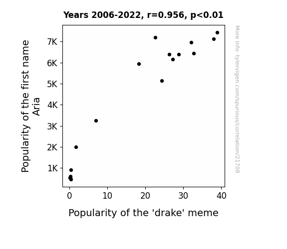 This means 91.4% of the change in the one variable (i.e., Popularity of the 'drake' meme) is predictable based on the change in the other (i.e., Popularity of the first name Aria) over the 17 years from 2006 through 2022.