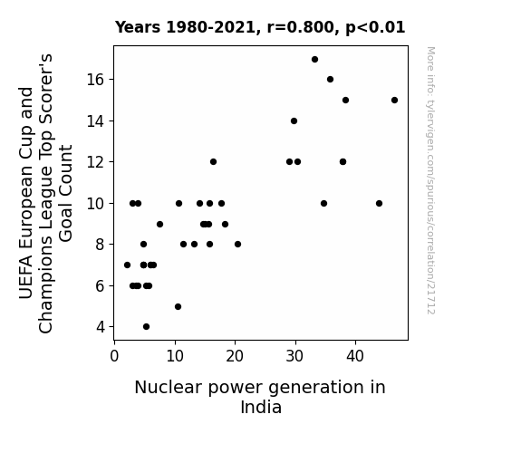 This means 63.9% of the change in the one variable (i.e., Nuclear power generation in India) is predictable based on the change in the other (i.e., UEFA European Cup and Champions League Top Scorer's Goal Count) over the 42 years from 1980 through 2021.