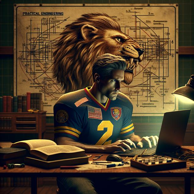 ChatGPT: [ Symbolism ] A person sitting at their desk, typing "Practical Engineering" into the Google search bar on their computer while wearing a Detroit Lions football jersey that is covered with patches representing the team's journey through seasons (with wins and losses). The person's posture and surroundings should portray their dedication to seeking knowledge and improvement within the field of engineering, as well as their unwavering support for their team, despite challenges. The imagery should evoke the themes of determination, perseverance, and commitment to both professional growth and personal passions.