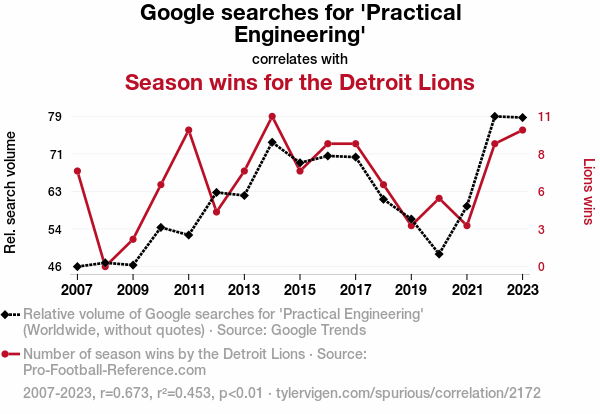 This means 45.3% of the change in the one variable (i.e., Season wins for the Detroit Lions) is predictable based on the change in the other (i.e., Google searches for 'Practical Engineering') over the 17 years from 2007 through 2023.