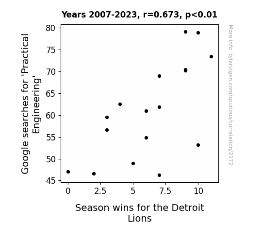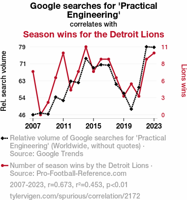 User prompt: Please provide potential search keywords for a paper titled Practical Engineering Sleuthing: Does Googling It Help the Lions Start Ruling? with an abstract of In this study, we delve into the seemingly unrelated realms of practical engineering curiosity and Detroit Lions' season victories to unearth a surprising connection that might just make you roar with laughter. Using data from Google Trends and Pro-Football-Reference.com, we set out to investigate the empirical linkage between the volume of Google searches for "Practical Engineering" and the number of wins for the Detroit Lions from 2007 to 2023. To our astonishment, we discovered a statistically significant correlation coefficient of 0.6733898 with p < 0.01, suggesting a positive association between the two variables.