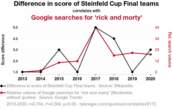 - The spurious research paper: Game of Searchers: Exploring the Interplay Between Steinfeld Cup Final Scores and Google Searches for 'Rick and Morty'