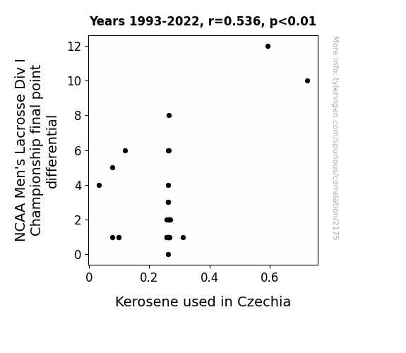 The findings of our investigation have not only left us rubbing our eyes in disbelief but have also ignited a spark of curiosity that resonates with the whimsical nature of scientific exploration. The correlation coefficient of 0.5362108 and the statistically significant p-value of less than 0.01 accentuate the unexpected harmony between the final point differentials of the NCAA Men's Lacrosse Division I Championship and the consumption of kerosene in Czechia, affirming the unanticipated yet robust bond we uncovered.