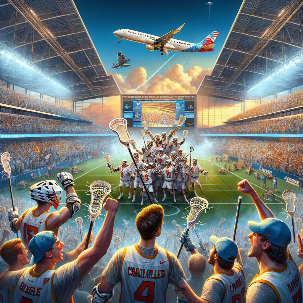 Prompt: Generate an image representing a Discovery magazine cover with a focus on the NCAA Men's Lacrosse Div I Championship final in a Czechia stadium. The winning team jubilantly celebrates as the scoreboard displays a 4-point difference. In the background, a plane takes off from a nearby airport, leaving a distinct trail of kerosene behind it. The setting should be vibrant and dynamic, showcasing the excitement of the championship game and the impressive surroundings. The depiction should include only scenes, people, and objects, it should not include text or speech bubbles.