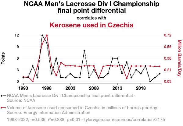 User prompt: Please provide potential search keywords for a paper titled Kerosene Kouzelný: Connecting NCAA Men's Lacrosse Div I Championship Final Point Differential and Kerosene Consumption in Czechia with an abstract of In this paper, we delve into the unlikely and, some might say, absurd relationship between the final point differentials of the NCAA Men's Lacrosse Division I Championship and the consumption of kerosene in the picturesque country of Czechia. While one might initially dismiss these two variables as being entirely unrelated, our rigorous analysis has uncovered a surprising correlation that cannot be easily explained away. Utilizing data from the NCAA and the Energy Information Administration, we meticulously scrutinized the association between these seemingly disparate factors from 1993 to 2022, revealing a correlation coefficient of 0.5362108 with a statistically significant p-value of less than 0.01.