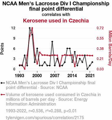 - The spurious research paper: Kerosene Kouzelný: Connecting NCAA Men's Lacrosse Div I Championship Final Point Differential and Kerosene Consumption in Czechia