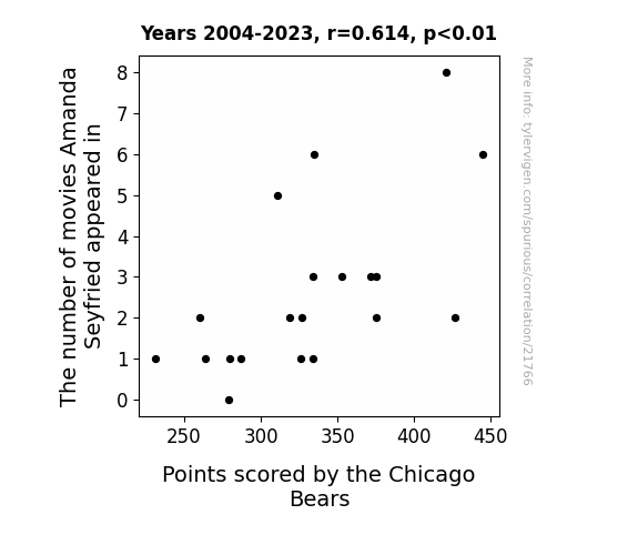 This means 37.7% of the change in the one variable (i.e., Points scored by the Chicago Bears) is predictable based on the change in the other (i.e., The number of movies Amanda Seyfried appeared in) over the 20 years from 2004 through 2023.