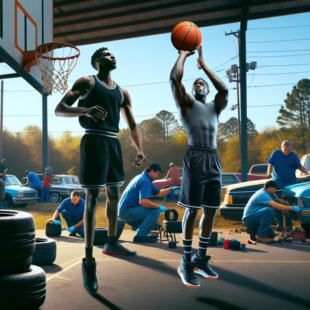 Prompt: Prompt: [Cutsy art illustration] Create an image of LeBron James taking a powerful shot in the middle of a basketball court. The basketball court is vibrant and full of energy. The scene is set in North Carolina, where in the parking lot outside, a team of tire repairers and changers works diligently on several cars. The sound of the basketball hitting the net resonates across the court as the tire repairers carefully complete their tasks, creating a dynamic visual representation of both LeBron's field goal count and the number of tire repairers and changers in North Carolina. Capture the contrasting yet harmonious energy of the basketball court and the parking lot. The depiction should include only scenes, people, and objects, it should not include text or speech bubbles.