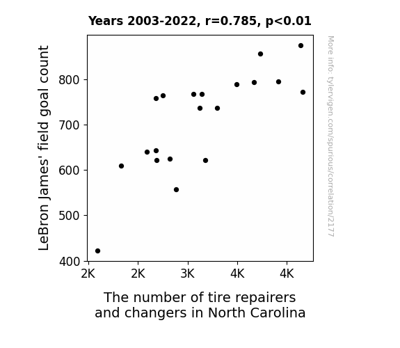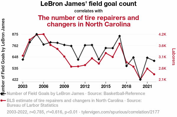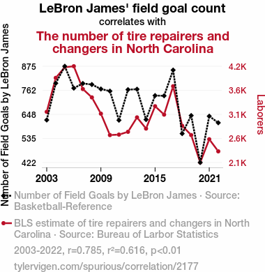 - The spurious research paper: Shooting for Change: The Correlation Between LeBron James' Field Goals and the Tire Repair and Changer Workforce in North Carolina