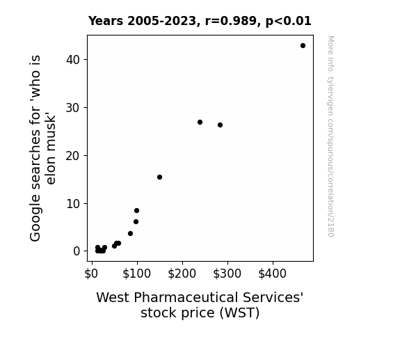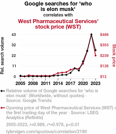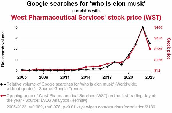 - The spurious research paper: Elon, Have You WSTed? Unveiling the Correlation Between Google Searches for 'Who is Elon Musk' and West Pharmaceutical Services' Stock Price