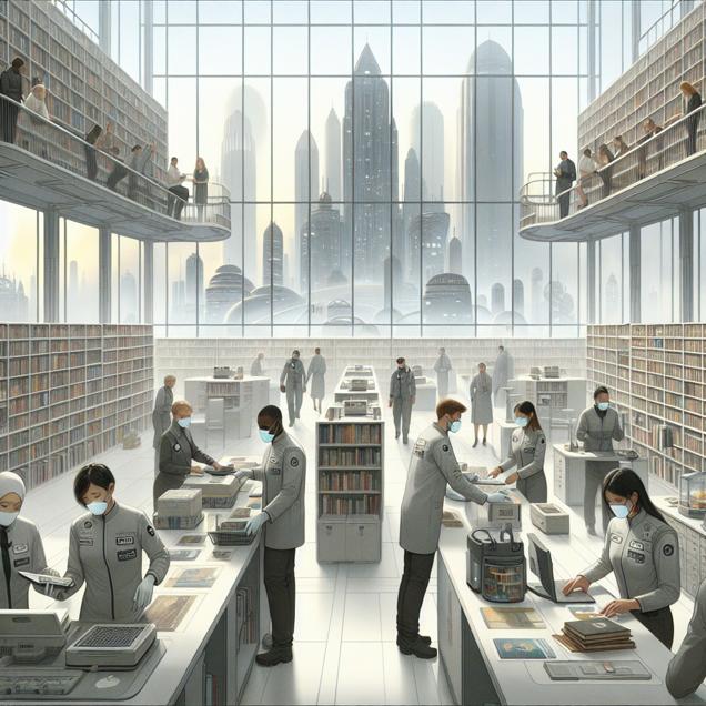 User prompt: Please respond with an image generation prompt that would be likely to create an interesting visual using DALLE-3, using the following style: [ Futuristic ] and depicting this scene: In Iowa City, a group of library technicians wear face masks as they work to organize bookshelves and assist patrons, mindful of the less than ideal air quality outside. The smoky haze from nearby wildfires has affected the air, but the technicians are dedicated to providing a peaceful and resourceful environment within the library. Keep the visual depiction simple. Do not include any words or speech bubbles.