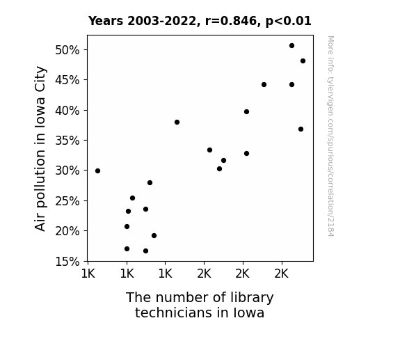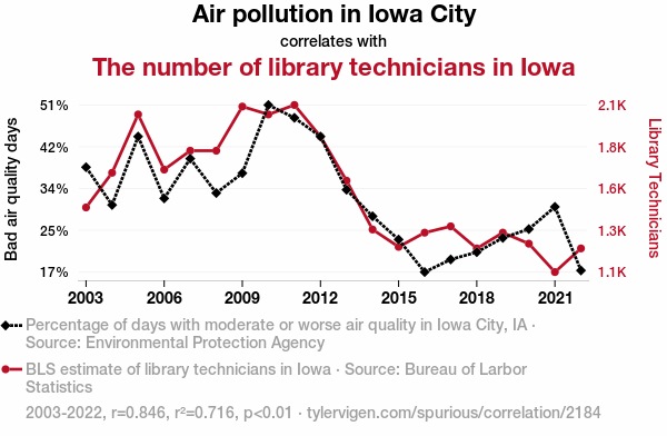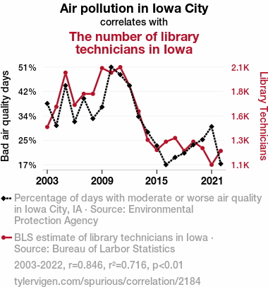- The spurious research paper: The Air We Breathe: A Study on the Correlation Between Air Pollution in Iowa City and the Employment of Library Technicians in Iowa