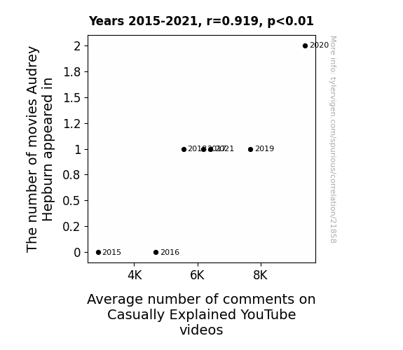 This means 84.5% of the change in the one variable (i.e., Average number of comments on Casually Explained YouTube videos) is predictable based on the change in the other (i.e., The number of movies Audrey Hepburn appeared in) over the 7 years from 2015 through 2021.