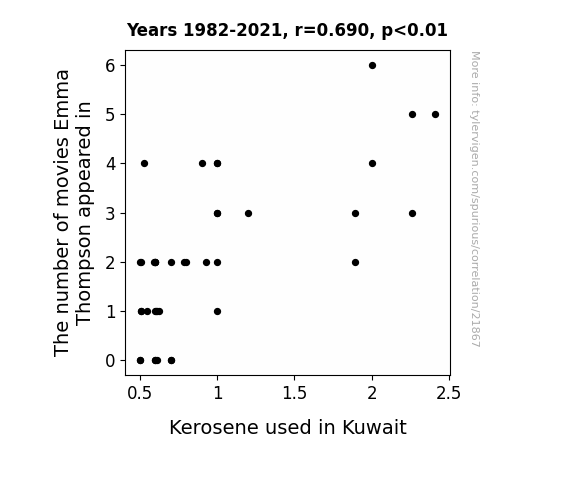 This means 47.5% of the change in the one variable (i.e., Kerosene used in Kuwait) is predictable based on the change in the other (i.e., The number of movies Emma Thompson appeared in) over the 40 years from 1982 through 2021.