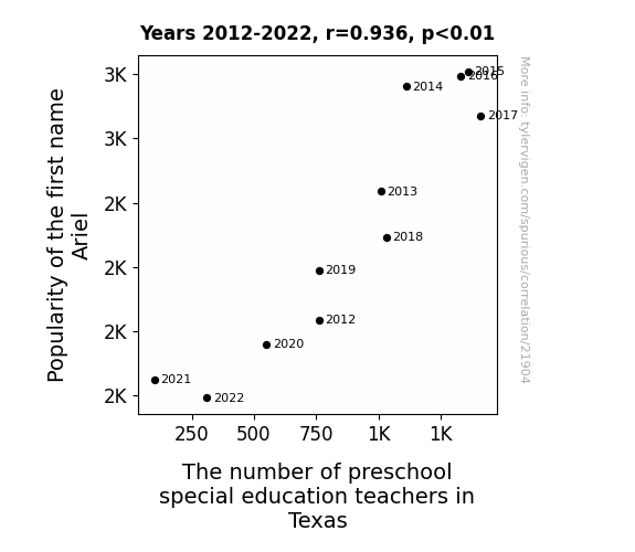This means 87.6% of the change in the one variable (i.e., The number of preschool special education teachers in Texas) is predictable based on the change in the other (i.e., Popularity of the first name Ariel) over the 11 years from 2012 through 2022.