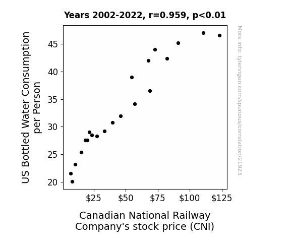 This means 92% of the change in the one variable (i.e., Canadian National Railway Company's stock price (CNI)) is predictable based on the change in the other (i.e., US Bottled Water Consumption per Person) over the 21 years from 2002 through 2022.
