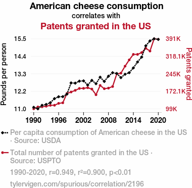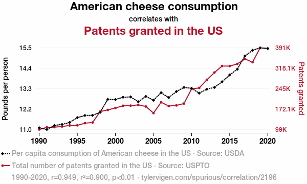 - The spurious research paper: Say Cheese! An Examination of the Correlation Between American Cheese Consumption and Patents Granted in the United States