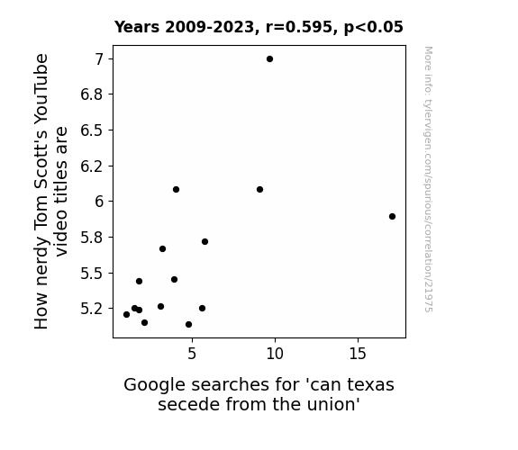 This means 35.4% of the change in the one variable (i.e., Google searches for 'can texas secede from the union') is predictable based on the change in the other (i.e., How nerdy Tom Scott's YouTube video titles are) over the 15 years from 2009 through 2023.