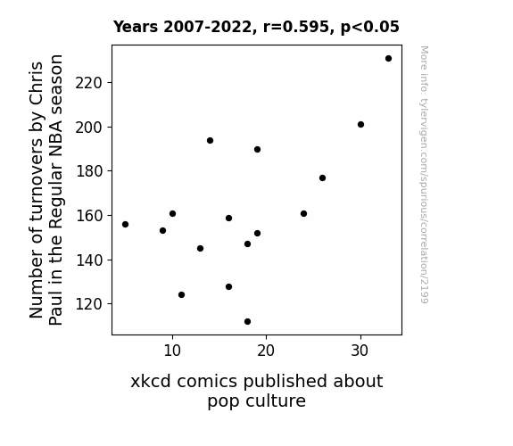 User prompt: Please provide potential search keywords for a paper titled The Tenuous Ties between Turnovers by Chris Paul and xkcd Comics: An Analysis of Pop Culture Phenomena with an abstract of This paper presents a comprehensive examination of the potential correlation between the number of turnovers committed by professional basketball player Chris Paul during the regular NBA season and the presence of xkcd comics related to pop culture topics. Drawing upon data from the NBA regular season statistics and utilizing AI analysis of xkcd comics, our research team sought to shed light on this peculiar association. Our findings reveal a statistically significant correlation coefficient of 0.5945814 with a p-value less than 0.05 for the years spanning from 2007 to 2022. While the nature of this relationship remains enigmatic, the unexpected coherence between these seemingly disparate realms sparks curiosity and warrants further investigation. This study not only offers a novel perspective on the intersection of sports and popular culture but also underscores the delightful unpredictability that accompanies the examination of unconventional linkages.