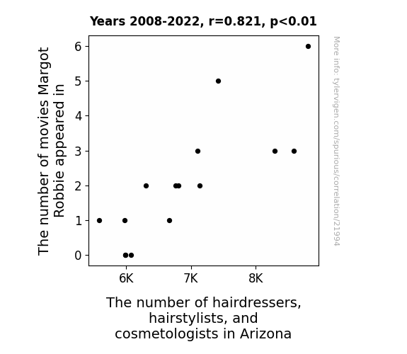 This means 67.4% of the change in the one variable (i.e., The number of hairdressers, hairstylists, and cosmetologists in Arizona) is predictable based on the change in the other (i.e., The number of movies Margot Robbie appeared in) over the 15 years from 2008 through 2022.