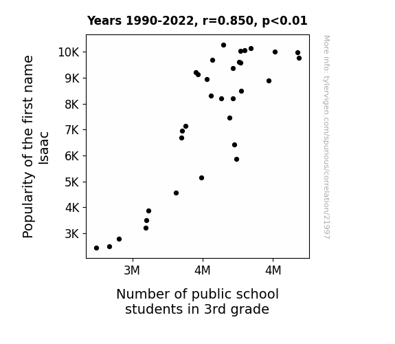 This means 72.2% of the change in the one variable (i.e., Number of public school students in 3rd grade) is predictable based on the change in the other (i.e., Popularity of the first name Isaac) over the 33 years from 1990 through 2022.