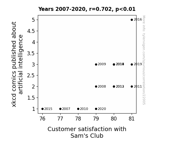 This means 49.2% of the change in the one variable (i.e., Customer satisfaction with Sam's Club) is predictable based on the change in the other (i.e., xkcd comics published about artificial intelligence) over the 14 years from 2007 through 2020.