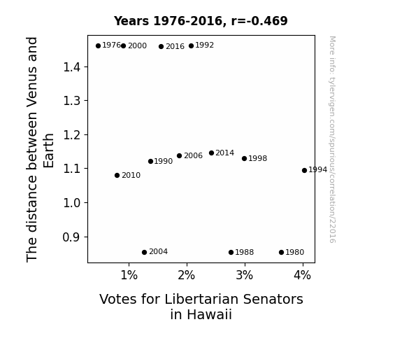 This means 22% of the change in the one variable (i.e., Votes for Libertarian Senators in Hawaii) is predictable based on the change in the other (i.e., The distance between Venus and Earth) over the 13 years from 1976 through 2016.