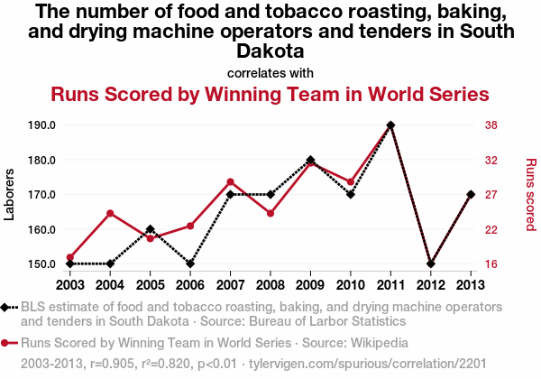 This means 82% of the change in the one variable (i.e., Runs Scored by Winning Team in World Series) is predictable based on the change in the other (i.e., The number of food and tobacco roasting, baking, and drying machine operators and tenders in South Dakota) over the 11 years from 2003 through 2013.