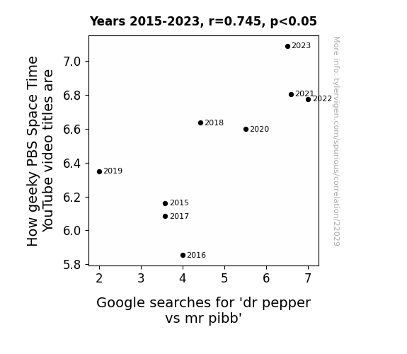 This means 55.5% of the change in the one variable (i.e., Google searches for 'dr pepper vs mr pibb') is predictable based on the change in the other (i.e., How geeky PBS Space Time YouTube video titles are) over the 9 years from 2015 through 2023.