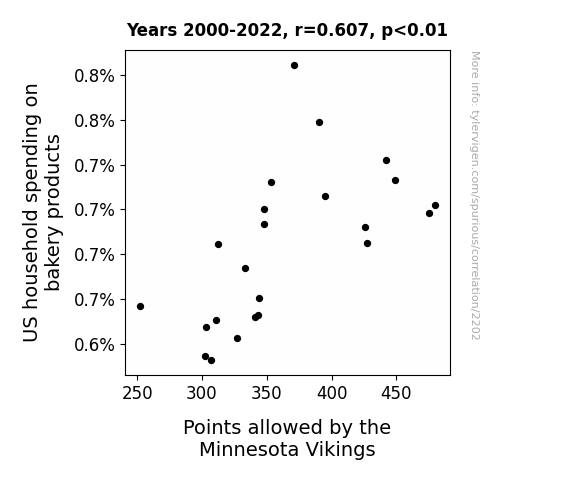 - The spurious research paper: Dough-Licious Defense: The Bready Link Between US Household Spending on Bakery Products and Points Allowed by the Minnesota Vikings