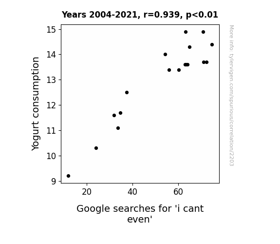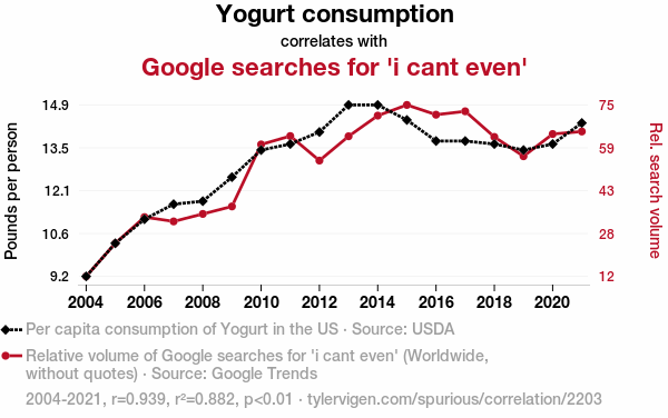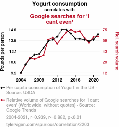 - The spurious research paper: Probiotics and Problems: The Yogurt-Google 'I Can't Even' Correlation
