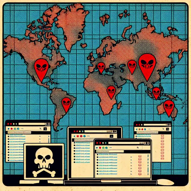 ChatGPT: Generate a comic-book-style illustration with muted colors and a dotted halftone pattern from the 1960s. Depict a world map with red skulls marking pirate attacks in the oceans and continents. Include a computer screen in the background showing multiple tabs open with Google searches for "download firefox" in different languages. The visual depiction should be simple and detailed.