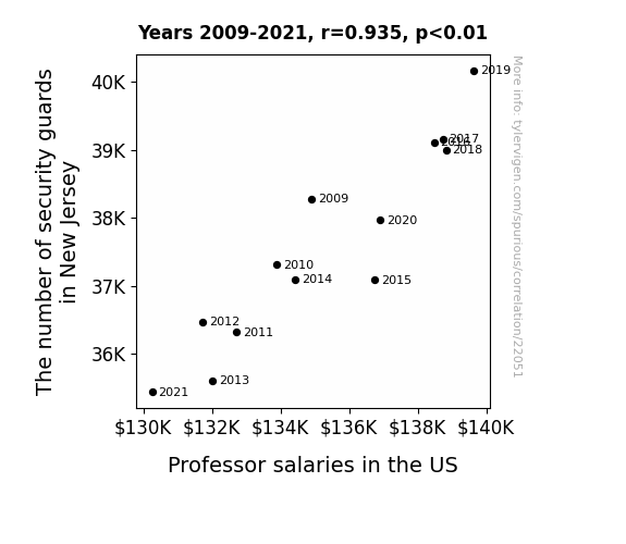 This means 87.4% of the change in the one variable (i.e., Professor salaries in the US) is predictable based on the change in the other (i.e., The number of security guards in New Jersey) over the 13 years from 2009 through 2021.