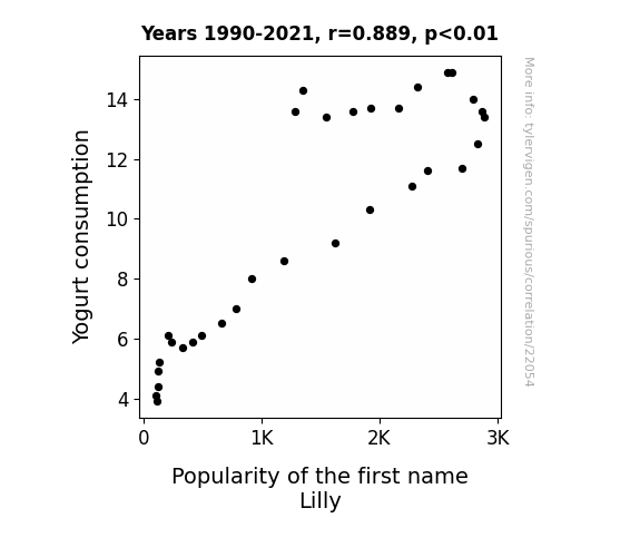 This means 79.1% of the change in the one variable (i.e., Popularity of the first name Lilly) is predictable based on the change in the other (i.e., Yogurt consumption) over the 32 years from 1990 through 2021.